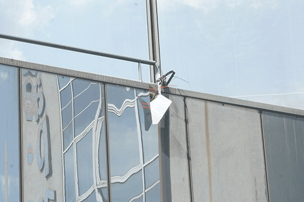 Quatre dispositifs, mi-robots mi-rebuts, quatre greffes autonomes jouent de non espaces. Puisant leur énergie dans les spots perpétuellement allumés de ces lieux ou dans la course du soleil, ils créent des jeux de reflets en mouvement.
