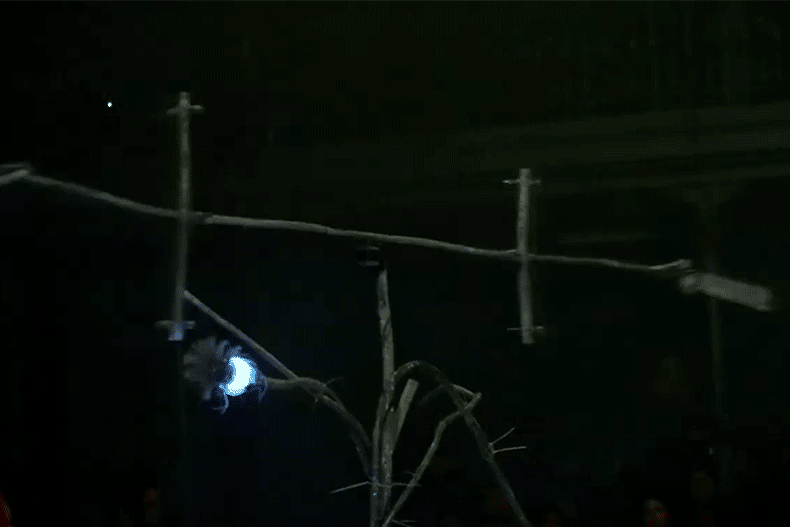 Une sorte de mangrove aux reflets métalliques s’anime une fois que l’on a soufflé dans ses longues racines-flûtes. Certains de ses nœuds se transforment alors en raves-lucioles, des cimes mécaniques tourbillonnent et créent des drones sonores et sous les stromboscopes les racines semblent commencer à se mouvoir.