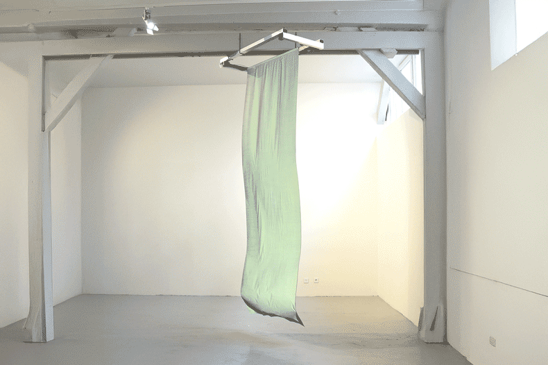 Un long tissu argent découpe l’horizon de la pièce. Un bruit de moteur rompt le silence,